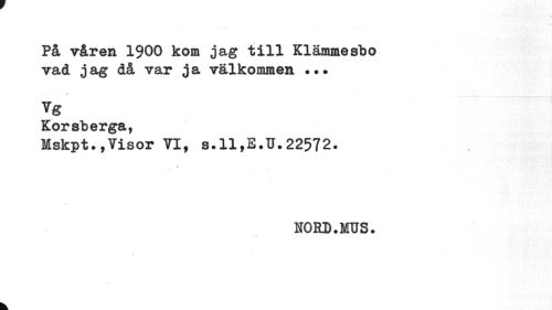 //// j //// På våren 1900 kom jag till Klämmesbo vad jag då var ja välkommen ••• //// Vg //// Korsberga, //// Mskpt.,Visor VI, s.11,E.U.22572. //// NORD.MUS. //// > //// k ////