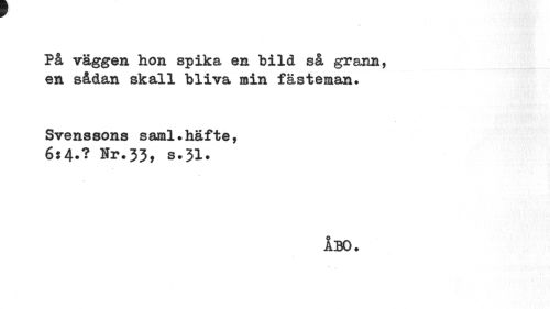 //// * //// På väggen hon spika en bild så grann, en sådan skall bliva min fästeman» //// Svenssons saml.häfte, //// 6*4»? Nr.33, s.31. //// ÅBO. ////