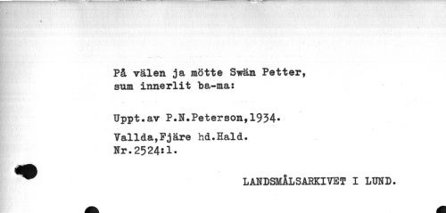 //// & * ! . ' //// ¦ //// ___ . --- . - . - i.. • . •• • - ... //// På valen ja mötte Swän Petter, sum innerlit ba-ma: //// Uppt.av P.N.Peterson,1934- //// Valida,Fjäre hd.Hald. //// Nr.2524:1. //// ^ L ANDSMÅL SARKIVET I LUND. ////