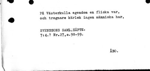 //// w //// På Västerkulla egendom en flicka var, ^^ och trognare kärlek ingen människa har, //// SVENSSONS SAML.HÄFTE: //// ¦ 7:4.? Nr»27,s.98-99' //// i //// l åbo. ////