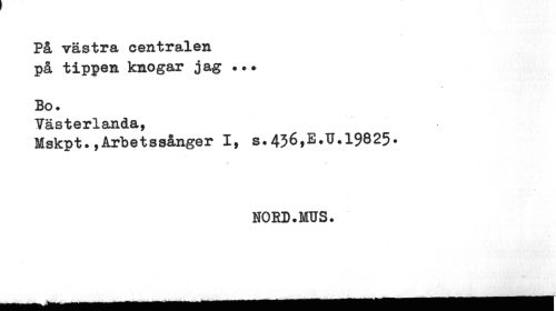 //// På västra centralen på tippen knogar jag «•. //// Bo» //// Yästerlanda, //// Mskpt., Arbets sånger I, s. 436,E.U.19825- //// i, //// NOED.MUS. ////