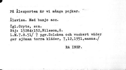 //// På llexporten är vi många pojkar» //// Ålavisa» Med banjo acc. //// Ögl»Gryts, sin. //// Rtj: 152845152,Nilsson,G. //// L.M.7.8.51/ 7 pgr»Solsken och vackert väder ger sjöman torra kläder, 7,12,1951,&anus»/ //// EA INSP. //// 1 //// t //// -m ////