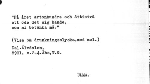 //// * F~i //// "På året artonhundra och åttiotvå ett öde det sig hände, //// som ni betänka må.11 i //// ¦ //// (Visa om drunkningsolycka,med mel.) J //// Dal.Älvdalen, • //// 8901, s.2-4*ihs,T.G. 5 //// - ¦ f //// m //// i //// ULMA. //// r ////