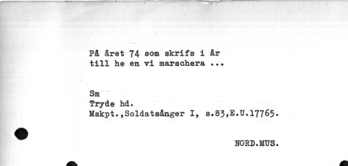 //// r //// ¦ //// På året 74 som skrifs i år till he en vi marschera ..• //// Sm //// Tryde hd. //// Mskpt.,Soldatsånger I, s.83,E.U.17765. //// ^ NORD.MUS. ////