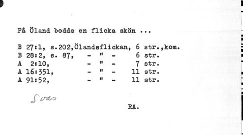 //// m //// i //// På Öland bodde en flicka skön ... //// p //// B 27:1, s.202,Ölandsflickan, 6 str.,kom. ; //// B 28:2, s. 87, - " - 6 str. i //// A 2:10, - » - 7 str. //// A 16:351, - " - 11 str. ^ //// A 91:52, - " - 11 str. = //// J //// RA. //// ¦ ////