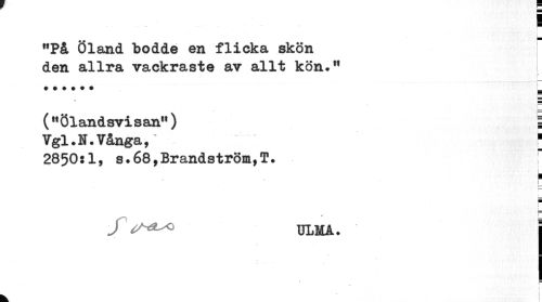 //// I //// ! //// wPå Öland bodde en flicka skön //// den allra vackraste av allt kön*1' //// • __ //// ("Ölandsvisan") \ //// Vgl.N.Vånga," ' //// 2850:1, s.68,Brandström,T. //// ; i //// ¦ //// L //// J ULMA. //// # //// % //// k ////