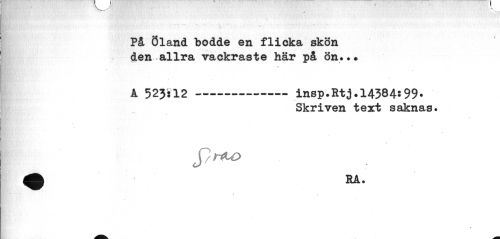 //// På Öland bodde en flicka skön den allra vackraste här på ön. //// A 523*12 --- insp.Rtj.14384*99» //// Skriven text saknas. //// \ //// J7 *u> //// SÅ. //// • . ////