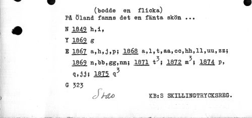 //// (bodde en flicka) På Öland fanns det en fänta skön ... //// A N 1849 //// Y 186? g //// E 1867 a,h,j,p; 1868 a,l,t,aa,cc,hh,ll,un,zzj 1869 n,bb,gg,nnj 1871 t5; 1872 m5? 1874 P, //// q^Oi 1825. <i3 a 523 //// J h£0 KB:S SKILLINGTRYCKSREG. //// 4 - //// Sk v* ' - ////