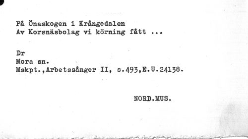 //// II //// På Önaskogen i Krångedalen Av Korsnäsbolag vi körning fått ..• //// Dr //// Mora sn. - //// Mskpt.,Arbetssånger II, s.493,E.U.24158. //// HORD.MUS. //// • » //// . V ^ ' • ' . * t . ...__-—— ^ ////