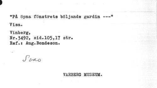 //// r I //// ! i //// wPå öpna fönstrets böljande gardin---11 //// Visa. Vinberg, //// Nr.3492, sid.105,17 str. Ref.: Aug.Bondeson. //// kP //// vårberg museum. ////