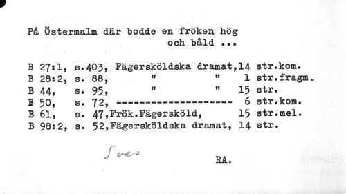 //// På Östermalm där bodde en fröken hög //// och båld ? //// b 27:1, s.403, Pägersköldska dramat, 14 str.kom. b 28:2, s. 88, 11 1 str.fragnu //// B 44, s. 95, H 11 15 str. //// I 50, s. 72,--- 6 str.kom. //// b 61, s. 47,Prök.Pägersköld, 15 str.mel. //// b 98:2, s. 52,Pägersköldska dramat, 14 str. //// RA. ////