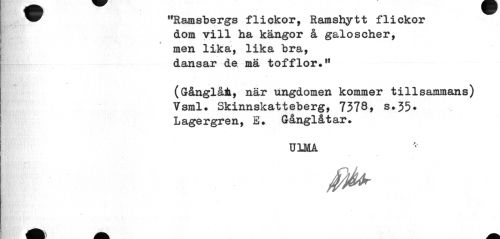 //// ^^ "Ramsbergs flickor, Ramshytt flickor //// dom vill ha kängor å galoscher, men lika, lika bra, dansar de mä tofflor." //// (Gånglåt, när ungdomen kommer tillsammans) //// Vsml. Skinnskatteberg, 7378, s.35. Lagergren, E. Gånglåtar. //// U1MA //// a _ _ ////