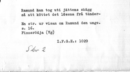 //// Ramund han tog uti jättens skägg så att köttet det lossna frå tänder- //// En str. ur visan om Ramund den unge. s. 16. //// Finnerödja (Vg) //// I.F.G.H.: 1020 //// J % //// l //// \...___...v ////