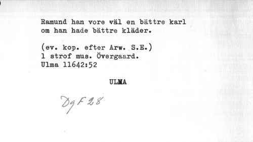 //// Ramund han vore väl en bättre karl om han hade bättre kläder. //// (ev. kop. efter Arw. S.E.) 1 strof mus. Övergaard. Ulma 11642*52 //// TJLMA //// * ////