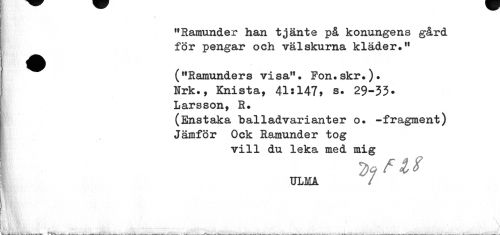 //// » //// "Ramunder han tjänte på konungens gård för pengar och välskurna kläder." //// ("Ramunders visa"• Fon.skr.). Nrk., Knista, 41*147» s. 29-33* Larsson, R. //// (Enstaka balladvarianter o. -fragment) Jämför Ock Ramunder tog //// vill du leka med mig //// ULMA / //// Lav j^t * \ ////