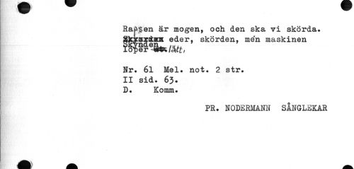 //// Rap$en är mogen, och den ska vi skörda. //// f^näen* e(*er> skörden, men maskinen //// Nr. 61 Mel. not. 2 str. II sid. 63* D. Komm. //// PR. NODERMANN SÅNGLEKAR ////