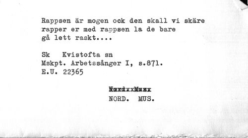 //// Rappsen är mogen ock den skall vi skäre rapper er med rappsen la de bare gå lett raskt»... //// Sk Kvistofta sn //// Mskpt. Arbetssånger I, s.871» //// E.U. 22365 //// MORD. MUS. //// • a .»' ////