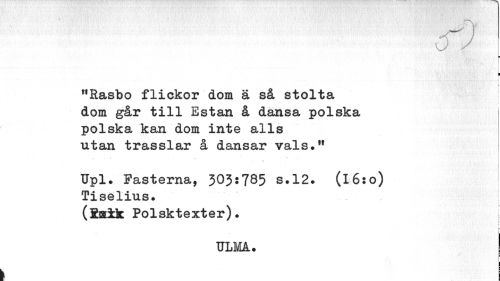 //// •C/ //// ¦ //// I \ //// • • ' 'v'--; ; • \ //// "Rasbo flickor dom ä så stolta dom går till Estan å dansa polska polska kan dom inte alls utan trasslar å dansar vals." //// Upl. Fasterna, 303:785 s.12. (l6:o) Tiselius. //// (Saik Polsktexter). //// i- //// ULMå. | //// t j ////