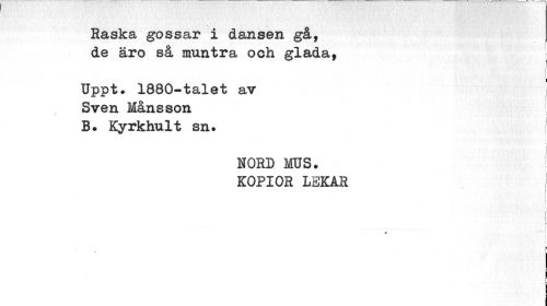 //// Easka gossar i dansen gå, de äro så muntra och glada, //// Uppt* 1880-talet av j //// Sven Månsson B# Kyrkhult sn. //// v //// NORD MUS. KOPIOR LEKAR //// j //// t //// i ¦ //// i ////