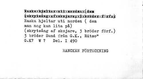 //// ¦ //// ^skxgctxås^xxfxskK^srxyxJxfersiaxxföxfI //// Raska hjeltar uti norden ( dem man nog kan lita på) //// (skrytsång af skojare, 3 bröder förf.) 3 bröder Sund från G.K., Rätso" G.K? W ? Del. I 490 //// RANCKEN FÖRTECKNING //// ___. .. j._ JéSj___ iiia...»___•arn-i"- ¦ -- - ////