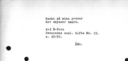 //// \ //// Raska på mina gossar det skymmer snart. //// 4:4 H-fors //// Svenssons saml. häfte Nr. 23. s. 49-50. //// ÅBO. ////