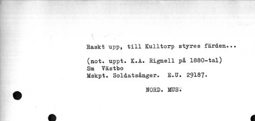 //// i ' ^ //// Raskt upp, till Kulltorp styres färden... //// \ //// (not. uppt. K.A. Rignell på 1880-tal) Sm Västbo //// Mskpt. Soldatsånger. E.U. 29187* ^ NORD. MUS* ////