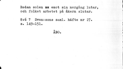 //// Redan solen ss emot sin nergång lutar, ! //// och folket arbetet på åkern slutar. //// . » ... //// 8:6 ? Svenssons saml. häfte nr 27» //// s. 149-151. : //// ÅBO. 1 //// i | //// C //// I //// f //// ? i //// k ////