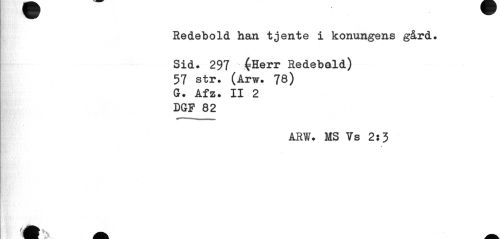//// Redebold hari tjente i konungens gård. //// Sid* 297 ^Herr Redebold) 57 str. (Arw. 78) G. Afz. II 2 DGF 82 //// ARW. MS Vs 2:3 //// s ////