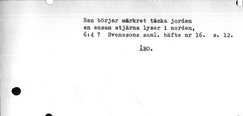 //// MftJL-- //// Ren börjar märkret täcka jorden //// en ensam stjärna lyser i norden, //// 6:4 ? Svenssons saml* häfte nr 16. s. 12. //// ÅBO. //// • \ > . * ////