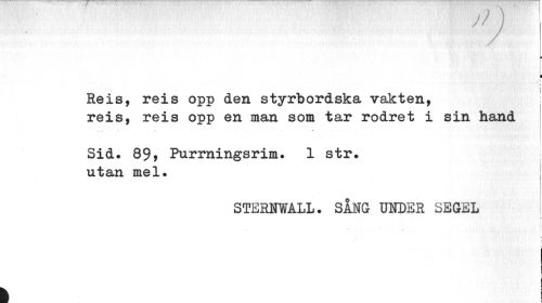//// v //// ¦ I //// I //// k //// Reis, reis opp den styrbordska vakten, //// reis, reis opp en man som tar rodret i sin hand //// Sid. 89, Purrningsrim. 1 str. //// utan mel. j //// i i //// STERNWÅLL. SÅNG UNDER SEGEL //// I- //// a //// i ////
