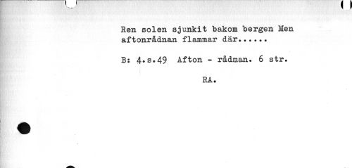 //// Ren solen sjunkit bakom bergen Men aftonrådnan flammar där... //// B: 4*s.49 Afton - rådman. 6 str. //// RA. ////