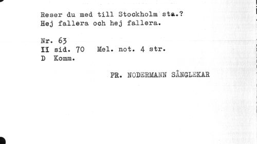 //// i //// Reser du med till Stockholm sta.? ' //// Hej fallera och hej fallera. //// Nr. 63 f //// l //// II sid. 70 Mel. not. 4 str. D Komm. //// ! //// ! //// PR. NODSRMANN SÅNGLEKAR //// b [ //// I //// I ////