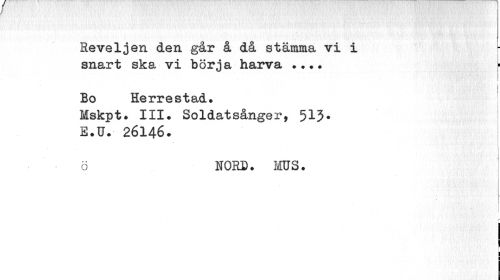 //// Reveljen den går å då stämma vi i //// snart ska vi börja harva ¦ //// i //// Bo Herrestad. //// Mskpt. III. Soldatsånger, 513' //// E.U. 26146. //// ö NORD. MUS. //// r j //// i 1 //// 1 ////