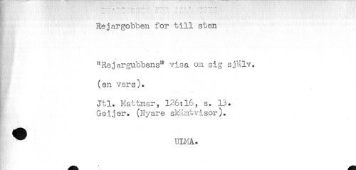 //// - --- '• •• ... •. ... . ... „ •• - - ..-.- //// ... . . ... //// Re jargobben for till sten //// ' ' i • ' • //// ; //// v //// Re j ar gubbens1* visa om sig själv, (en vers). //// ? ma- ,, * //// Jtl. Mattmar, 126:16, s. 13. Geijer. (Nyare skämtvisor). //// ^ ULMA. ////