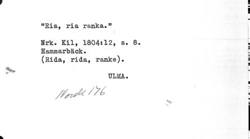 //// I //// "Ria, ria ranka." //// _ ^ ¦* ¦ ' //// Nrk. Kil, 1804»12, s. 8. t Hammarbäck. //// (Rida, rida, ranke). j //// ULMA. //// fl //// //^ t //// ^ g //// m //// •s //// k. L ////
