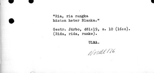 //// f,Ria, ria rangka ^ hästen heter Blanka»M //// Gestr. Järbo, 481:19, s. 10 (l6:o). //// (Rida, rida, ranke). //// ULMA. //// 4/gtdtW //// t ////