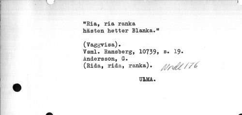 //// tfRia, ria ranka w //// hästen hetter Blanka.11 (Vaggvisa). //// Vsml. Ramsberg, 10739» s. 19. //// Andersson, G. (Rida, rida, ranka). //// >.. (d i //// ULMA. ////
