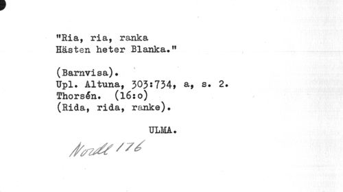 //// "Ria, ria, ranka Hästen heter Blanka." //// (Barnvisa). //// Upl. Åltuna, 303:734» a, s. 2. Thorsén. (l6:o) (Rida, rida, ranke). //// ULMA. ////