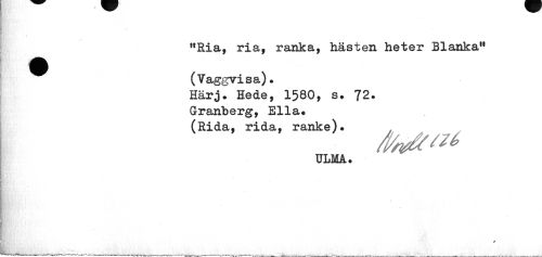 //// N //// "Ria, ria, ranka, hästen heter Blanka" //// ^^ (Vaggvisa). //// Härj. Hede, 1580, s. 72. Granberg, Ella. (Rida, rida, ranke). //// mm //// ULMA. //// ¦ //// ,-jj i - _>L «r - ¦¦ ir _ ////