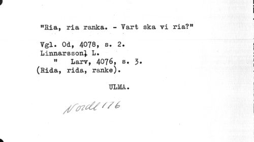 //// I i i //// "Ria, ria ranka. - Vart ska vi ria?" //// Vgl. Od, 4078, s. 2é i //// Linnarsson}. L. j //// " Larv, 4076, s. 3. j //// (Rida, rida, ranke). //// i //// r > //// ULMA. //// //-tfd/Sfé, //// 1 //// i //// 11 //// i //// 1 ////