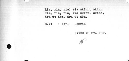 //// Ria, ria, ria, ria skinn, skinn Ria, ria, ria, ria skinn, skinn, dra ut döm, dra ut döm. //// S.21 1 str. Lekrin //// HARBS MS SVA KOP. //// 0" ////
