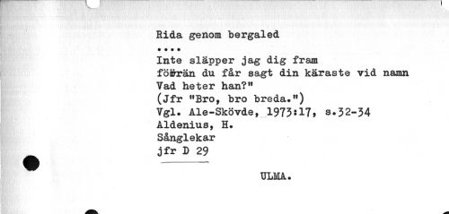 //// Rida genom bergaled t # • t //// Inte släpper jag dig fraia //// föifrrän du får sagt din käraste vid namn //// Vad heter han?" //// (Jfr "Bro, bro breda.") //// Vgl. Ale-Skövde, 1973:17, s.32-34 //// Aldenius, H. Sånglekar //// jfr D 29 //// ULMA. ////