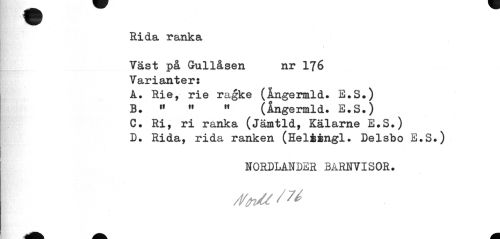 //// Rida ranka //// Väst på Gullåsen nr 1J6 Varianter: //// A. Rie, rie ragke (Ingermld. E.S.) //// B. 11 » " (Ångermld. E.S.) //// C. Ri, ri ranka (Järntid, Kälarne E.S.) //// D. Rida, rida ranken (Helisngl. Delsbo E.S.) //// NORDLANDER BARNVISOR. //// /Vfi///7* ////