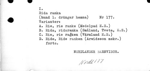 //// I. //// Rida ranka //// •(hund 1. drängar hemma) Nr 177» Varianter: //// A. Rie, rie ranke (Medelpad E.S.) //// B. Rida, ridaranka (Småland, Tveta, E.S.) G. Rie, rie ragken (Värmland E.S.) //// B. Ride, Ride ranken (Arwidsson mskr.) forts. //// NORDLANDER BARNVISOR. //// /pynt*/?? //// S* X ////