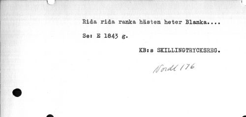 //// Ww* \! ' '"'i''*/1 " 'Vi ' '•' \ ¦ fi'i "v •'.' ' ' >.:' J.nf ',1-y.y •; -V:'v • ¦;. -j '• ;'?»••. • '"k s « v.'' ;* • • i '•''.'¦''<¦'' * 'v'!, v-V/ 1' •¦/'•i1' ¦¦'1 ¦'" ' • V/1'- V v /''Ä , .'V V . i 'vi' . - . ' .. ji-vii V<- '' v •' //// » * Aj , i //// Rida rida ranka hästen heter Blanka.• //// * //// Se: E 1843 g. //// KB:s SKILLIKGTEYCKSREG. ////