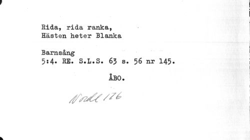 //// ¦ //// fe l //// Rida, rida ranka, Hästen heter Blanka //// '...t*V'?Ty... .'i //// Barnsång J //// 5:4» RE* S.L.S. 63 s. 56 nr 145* //// ÅBO. //// -1 //// | //// * i ////