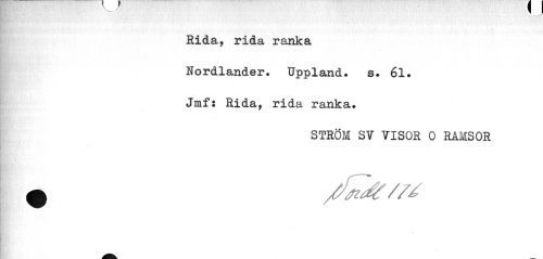 //// Rida, rida ranka Nordlander. Uppland. s. 61. Jmf: Rida, rida ranka. //// STRÖM SV VISOR 0 RAMSOR //// ^ /^e/u ////