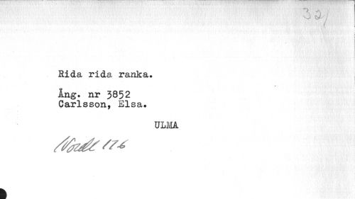 //// O tJ- / //// i //// i //// Rida rida ranka. I //// • ¦ //// Ång. nr 3852 Carlsson, Elsa. //// ULMA ////