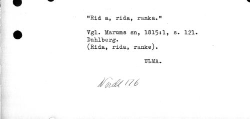 //// "Rid a, rida, ranka." //// A Vgl. Marums sn, 1815:1, s. 121. //// ^^ Dahlberg. //// (Rida, rida, ranke). //// ULMA. //// --""-'.v ////