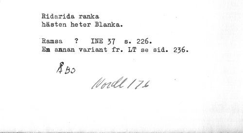 //// Ridarida ranka hästen heter Blanka. //// Ramsa ? INE 37 s. 226. Em annan variant fr. LT se sid. 236. ////